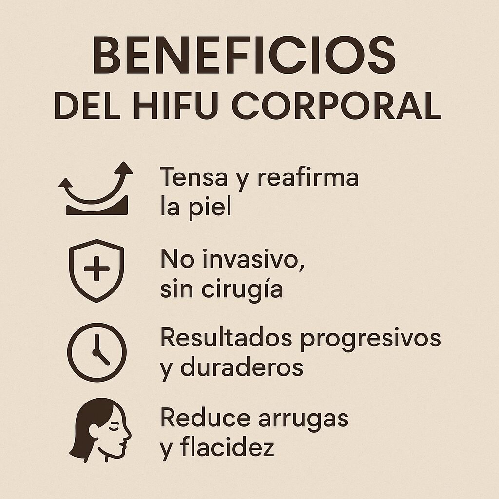 Es un tratamiento no invasivo de estética que utiliza ultrasonido focalizado de alta intensidad para penetrar en las capas profundas de la piel, estimulando la producción de colágeno y elastina. Este procedimiento está diseñado para tensar y reafirmar la piel, mejorando su firmeza y reduciendo la apariencia de arrugas, flacidez y líneas finas, especialmente en áreas como el rostro, el cuello y el abdomen. A diferencia de los tratamientos quirúrgicos, HIFU no requiere incisiones ni tiempo de recuperación, lo que lo convierte en una opción popular para quienes buscan una mejora en la calidad de la piel sin intervención quirúrgica. Los resultados suelen ser progresivos y pueden durar hasta un año o más, dependiendo del tipo de piel y cuidados posteriores.